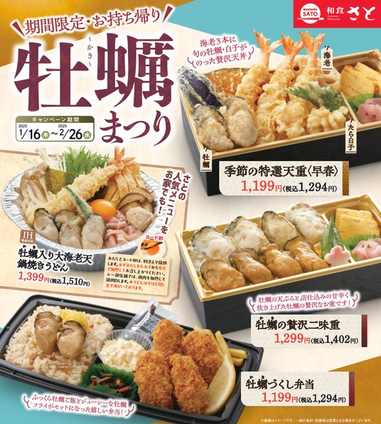 国内197店舗を展開する「和食さと」では、お持ち帰り『牡蠣まつり』と題して、牡蠣の天ぷらや牡蠣フライなど、牡蠣を使用したテイクアウトメニューを期間限定で販売します。また、お店で人気の「牡蠣入り大海老天鍋焼きうどん」を今回、テイクアウトの鍋メニューとして期間限定で販売します。コシのある太麺に、白菜やしめじなどの野菜と、鶏もも肉や鶏つくね団子などたっぷりの具材が入り、さらに卵は『ヨード卵・光』を使用!食べ応え抜群の大海老天ぷら、そして牡蠣も3粒入った、豪華な鍋焼きうどんです。さと特製のうどんつゆで炊いて、アツアツの鍋焼きうどんを是非お楽しみください。牡蠣たっぷりのお弁当や、寒い日にもぴったりな鍋焼きうどんを、期間限定で販売しますので、いつも和食さとをご利用頂いているお客さまも、初めてのお客さまも是非「和食さと」のテイクアウトキャンペーンをお楽しみください。