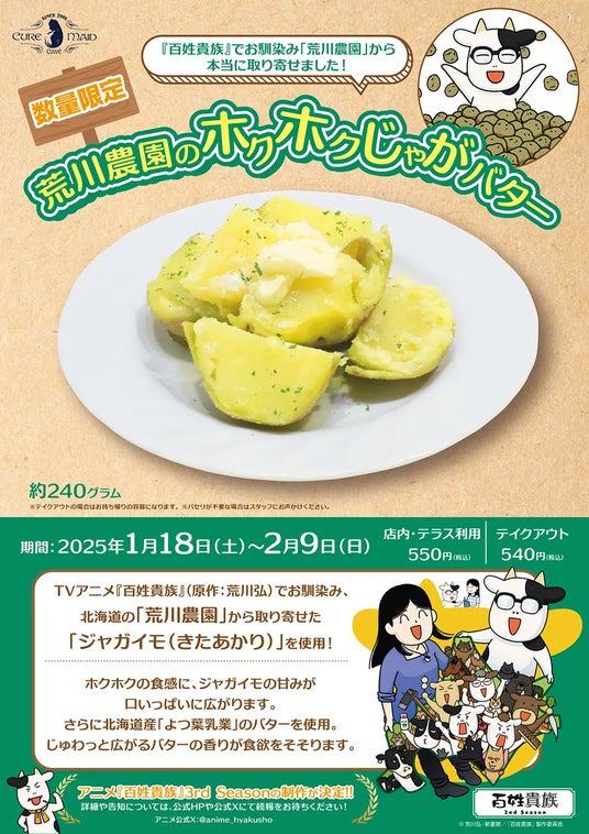 TVアニメ『百姓貴族』(原作:荒川弘)でお馴染み、北海道の「荒川農園」から取り寄せた「ジャガイモ(きたあかり)」を使用した「荒川農園のホクホクじゃがバター」が数量・期間限定で登場です。