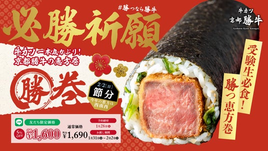 株式会社ゴリップ(本社:京都府京都市)が展開する「牛カツ京都勝牛」は、2月2日(日)の節分に向けて、受験や仕事のゲン担ぎにぴったりな牛カツ恵方巻「勝巻」を今年も発売いたします。