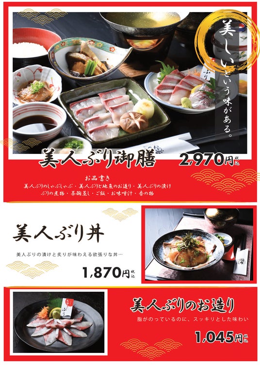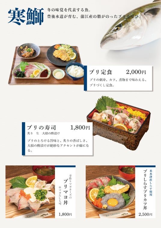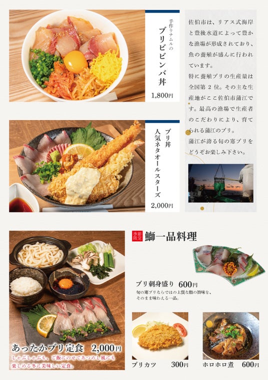新鮮な寒ブリを使用したブリ丼や刺身、ブリしゃぶなど、多彩なメニューをご用意しております。