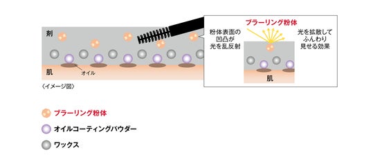 オイルコーティングパウダーのオイルが体温で溶けて密着。さらにワックスが粉体を固めてふんわり仕上がりキープ。