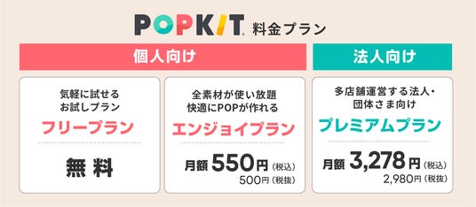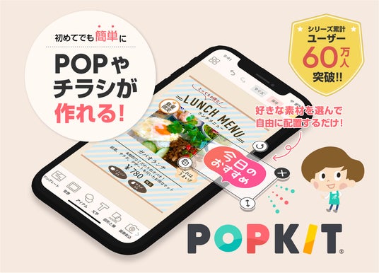 「POPKIT」は、シリーズ累計60万ユーザー突破の(※)POPデザイン作成ツール。あらかじめ入っている素材を組み合わせるだけで、誰でも簡単にPOP作成ができます。パソコン(WEB)・iPhone/iPad(アプリ)に対応。POPの他、チラシ・SNS・HP・動画サムネイル等、ビジュアル的な告知を行うあらゆるシーンで活用できます。