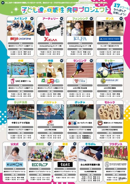 上述したように、子ども達に様々なスクールや習い事、活動を手軽に経験できる場を提供したいという想いから、KLスポーツで開校している9スクールに加え、本プロジェクトにご賛同頂きました8スクールのみなさまにもご協力頂き、2025年2月23日(日)に『子ども達の可能性発見プロジェクト』(主催:KLスポーツ/後援:春日井市教育委員会)と題して、全17のスクールが無料にて体験できる場を作らせて頂くことになりました。