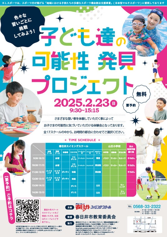2025年2月23日(日)、KLスポーツ春日井(愛知県春日井市勝川新町1-27)にて、『子ども達の可能性発見プロジェクト』と題して全17スクールによる無料体験会を開催致します。ぜひご参加下さい。