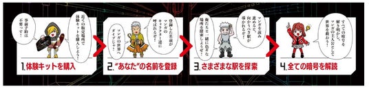体験キット(※)をソフマップ等の販売先でご購入及びお受け取りいただいたのち、漫画を読んで指定サイトにニックネームを登録すると、漫画上の主人公として“あなた”が登場します。また、漫画で得られる情報をもとに、リアルな街のなかで出題される謎を解いていくと、ストーリーと街での体験が連動した、“あなた”が主人公の物語が展開していきます。