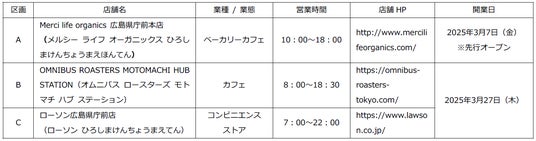 「広島県庁舎敷地有効活用事業」(以下、本事業)を推進する事業者「MOTOMACHI CONNECT」(代表法人:NTT都市開発株式会社、構成法人:NTTアーバンバリューサポート株式会社、デイ・ナイト株式会社、日本駐車場開発株式会社、アマノマネジメントサービス株式会社)は、広島県広島市中区基町10番50号(広島県庁舎敷地内)にて進める本事業において、このたび3つの出店テナントが決定し、2025年3月27日(木)に商業施設が開業することをお知らせいたします。