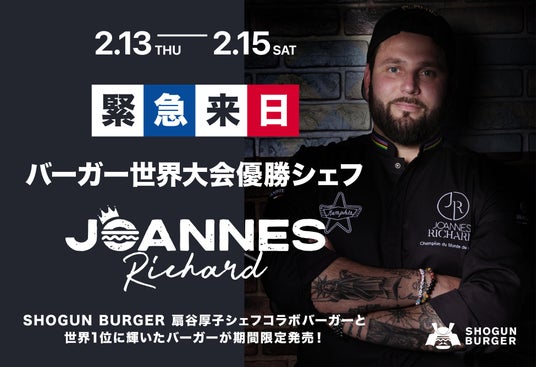 2023年ワールドフードチャンピオンシップ優勝者ジョアンズ・リチャードシェフと、SHOGUN BURGERのメインシェフ扇谷厚子による夢のコラボバーガーが3日間限定で登場します!この特別な味わいを楽しめるのは2月13日(木)・14日(金)・15日(土)のみ。各日、リチャードシェフと扇谷シェフが店舗に特別来店し、直接振る舞います。「最高の素材」と「シェフ2人の技術」が融合した究極のバーガーを体験できます。