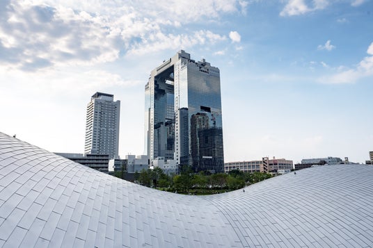 グラングリーン大阪に隣接する梅田スカイビルは、2棟のビルを屋上を含む上層部「空中庭園」で繋げる独特のフォルムをした世界初の連結超高層建築。
