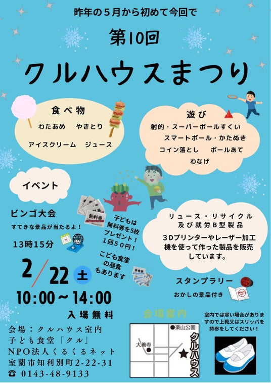 特定非営利活動法人くるくるネットが主催する地域交流イベント「第10回クルハウスまつり」が、2025年2月22日(土)に北海道室蘭市のクルハウスで開催されます。本イベントは、子どもから大人まで幅広い世代が楽しめるコンテンツを提供し、地域のつながりを深めることを目的としています。