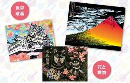 「富士山」や「清水寺」をはじめとする日本の名所のほか、可愛らしい犬や花など様々な作品をお楽しみいただけます。
