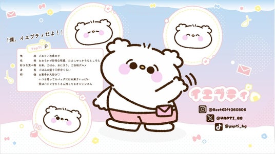 「ぼくイエプティ。ちいさなイエティの男の子だよ。寒い雪山からあたたかくて、おいしい物やわくわくがいっぱいありそうなトカイにやってきたよ。毛玉やぬいぐるみに間違えられたりしちゃうけど、おじいちゃん、ぼく、にんげんさんとなか良くなれるようにがんばるよ。」