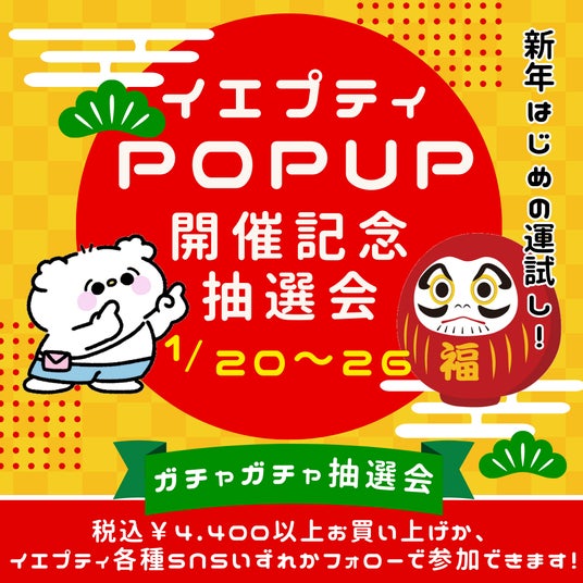 イエプティのSNS(Instagram・X・Tiktokいずれか)をフォロー、または税込¥4,400以上お買上げで、イエプティのグッズやアクセサリーなどが当たる抽選会にご参加いただけます。