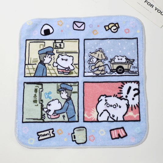 イエプティと駅員さんのほのぼのとしたやり取りの漫画のコマがかわいいハンドタオルです。イエプティが大好きなおにぎりやお菓子、トレードマークのズボンもデザインされています。