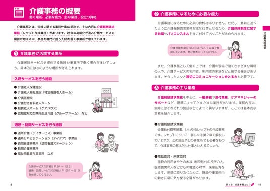 第1章では、介護事務が活躍する場所、介護事務に求められる能力、おもな業務内容、介護報酬のこと、連携する職種、役立つ資格などを解説しています。