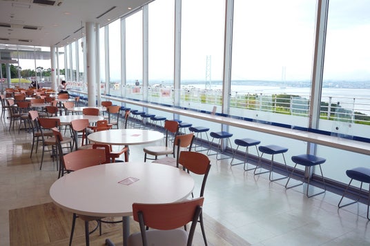 淡路サービスエリア(SA)上下線の各フードコートの広々とした店内客席からは、雄大な明石海峡の大パノラマが広がっております。特にカウンター席からの景観は抜群で、まさに絶景が目の前に広がります。
