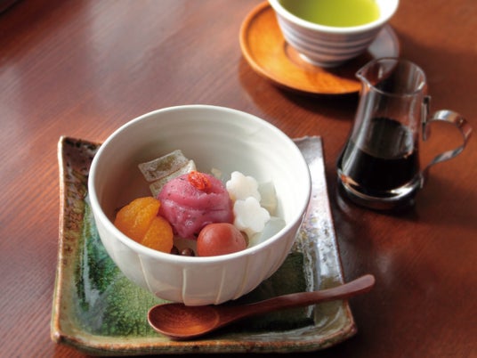 梅餡に梅のシロップ漬け、そして梅型のくず餅を添えた、まさに「梅づくし」のあんみつが登場。