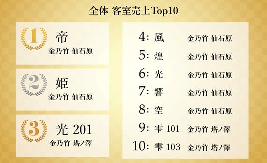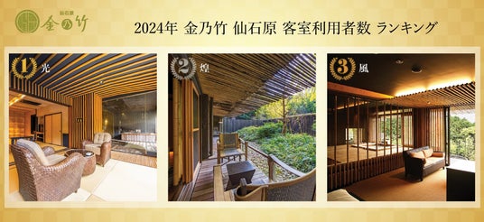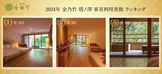 神奈川県 箱根で旅館5店舗・飲食店3店舗を運営する株式会社 金乃竹(本社:神奈川県箱根町 代表取締役社長:窪澤 圭 以下、金乃竹)は、客室数6室~21室のスモールラグジュアリーをモットーに、非日常空間を提供する金乃竹リゾートの宿泊施設4施設(金乃竹 仙石原・金乃竹 塔ノ澤・松坂屋本店・Hotel 坐樂閑)における、2024年度の客室ランキング(利用者数ランキング・売上ランキング・施設別ランキング)をまとめて発表いたします。