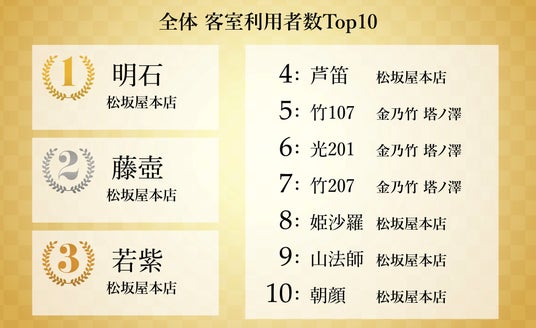 2023年の利用者数ランキングでは、「金乃竹 塔ノ澤」が6室、「松坂屋本店」が4室という結果でしたが、2024年には「松坂屋本店」が前年を上回り、7室を占める結果となりました。