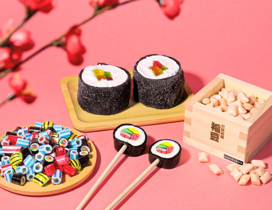 実寸大サイズの太巻きをふわふわなマシュマロで再現しました。酢飯をイメージしたレモンフレーバーのマシュマロの中にはフルーツフレーバーのグミが入っており、まるで本物の恵方巻きのような具沢山で食べ応えのある一品です。今年の節分には甘い恵方巻きをお試しください。