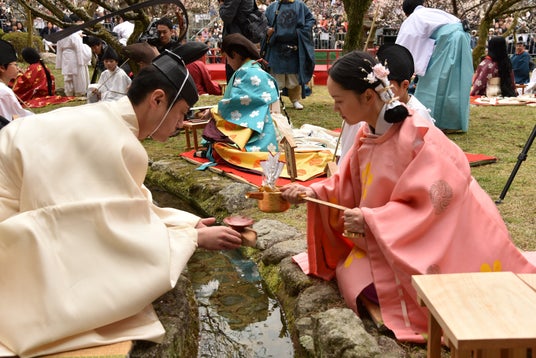 衣冠束帯・十二単などの平安の装束をまとった参宴者が、曲水の溝に浮かべられた杯が流れてくるまでに詩歌を詠み、盃を飲み干す禊払いの神事。雅楽が奏でられるなかでの平安の宴が再現されます。