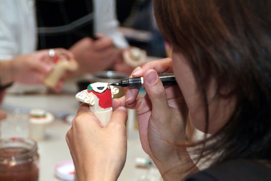 伝統工芸品「木うそ」の無料絵付け体験。鷽(うそ)鳥は天神さまの守り鳥とされる。