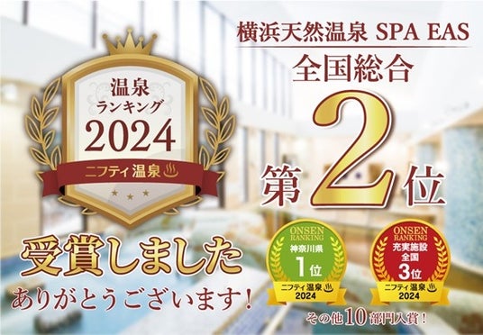 「横浜天然温泉SPA EAS」は、2024年12月19日に発表された「第19回ニフティ温泉 年間ランキング2024」にて日本全国17,998の施設の中から「全国総合ランキング第2位」を受賞