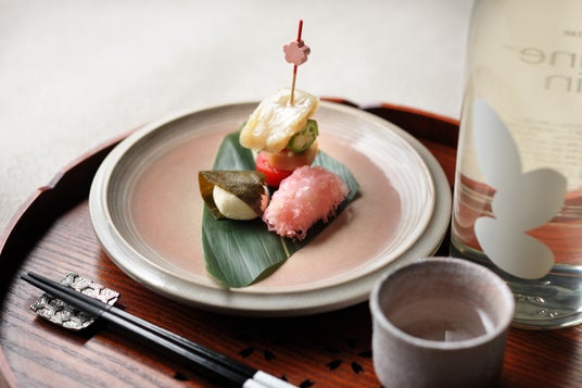 川床テラスを貸し切った特等席で、桜を眺めながら夕食前のひとときをゆったり楽しむことができる「夜桜アペロ」を用意します。山口県名産品であるふぐを使用し、春をイメージしたおつまみを3種類準備しました。ふぐの生ハム、香煎揚げ、雲丹とクリームチーズの桜餅を萩焼の器に盛って提供します。また、アペロのお供となるお酒には、ふぐの淡白な味わいと相性のよい、山口県美祢市の酒造の日本酒を選定しました。