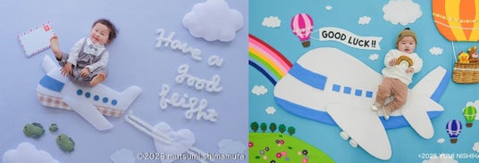 飛行機モチーフの背景や小道具で、一生の思い出に残るおひるねアートに。