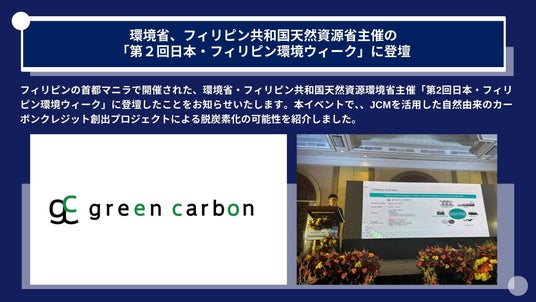 Green Carbon株式会社は、環境省、フィリピン共和国天然資源省主催の「第2回日本・フィリピン環境ウィーク」に登壇し、環境課題に対するカーボンクレジットの貢献可能性を紹介