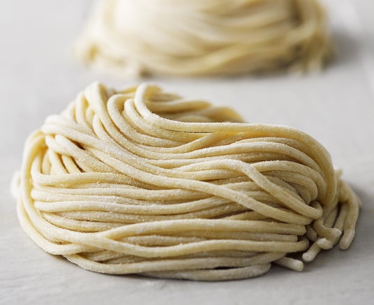 淡路島産デュラム小麦のセモリナ粉と北海道産小麦粉をブ レンド。水だけで打ち上げた生地を丁寧に熟成し、直径3ミリの特注の切り刃でカットした極太麺です。
