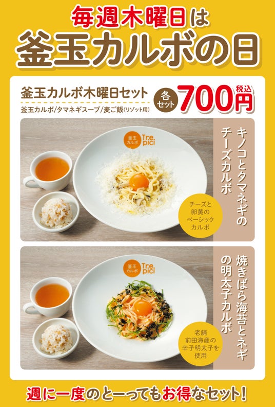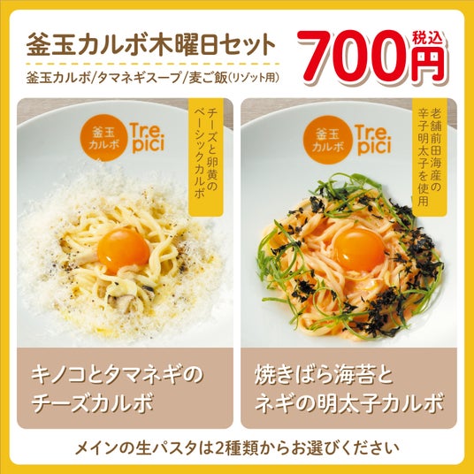 毎週木曜日は「釜玉パスタの日」釜玉カルボ木曜日セット700円(税込)