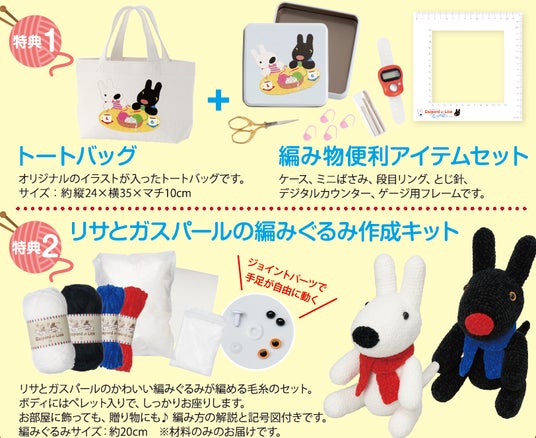定期購読をお申し込みの方全員に、「オリジナルトートバッグ」、「編み物便利セット」やボディにペレットが入っているのでしっかりとお座りする「リサとガスパールの編みぐるみ作成キット」をプレゼント。
