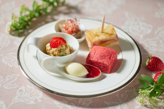 下段は、いちごならではの酸味と甘味を活かしたセイボリーをご用意。程よい塩気がアクセントの生ハムとチェダーチーズのサンドイッチには、いちごを使用したタルタルソースを合わせました。さらに、豊かな味わいが広がるいちごとジュペとパセリのスコーンや、いちごの入ったヴィネグレットソースをあわせたテリーヌなど、シェフの繊細なアレンジが満載の一皿です。