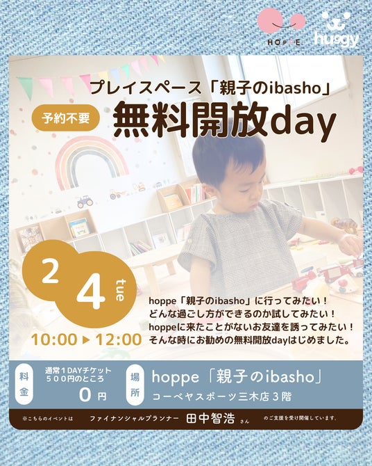 特定非営利活動法人ほっぺ(代表:大森奈津子・兵庫県三木市)は、2025年2月4日(火)、乳幼児親子のプレイスペースhoppe「親子のibasho」(コーベヤスポーツ三木店3階)を『無料開放day』とします。hoppe「親子のibasho」に行ってみたい!どんな過ごし方ができるのか試してみたい!hoppeに来たことがないお友達を誘ってみたい!そんな時におすすめできるのが『無料開放day』です。