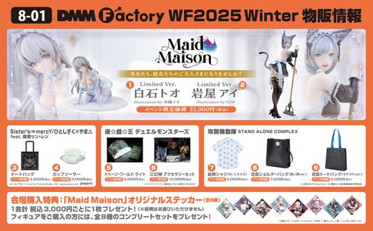 会場限定価格での販売のほか、ブースでお買い物をしていただくと1会計税込3,000円ごとにオリジナルフィギュアブランド「Maid Maison」のステッカー(全8種)をランダムで1枚プレゼント。