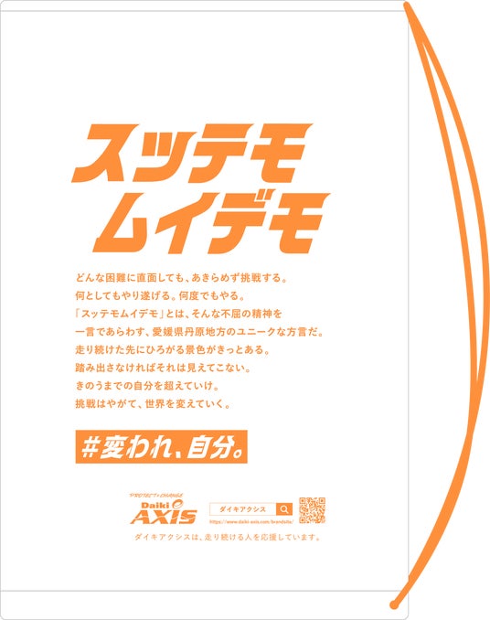 今回、一部ランナーの皆さまへ配布させていただく手荷物預け袋に、『スッテモ ムイデモ』という言葉をプリントしております。「スッテモ ムイデモ」とは、愛媛県丹原地方(西条市)の方言で「なにがなんでも」「是が非でも」という意味です。当社グループの創業者である大亀孝裕がよく口にしていた言葉で、現在の当社クレド(行動指針)の元となっている「社訓」にも含まれております。
