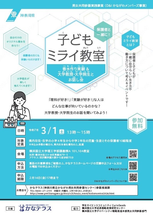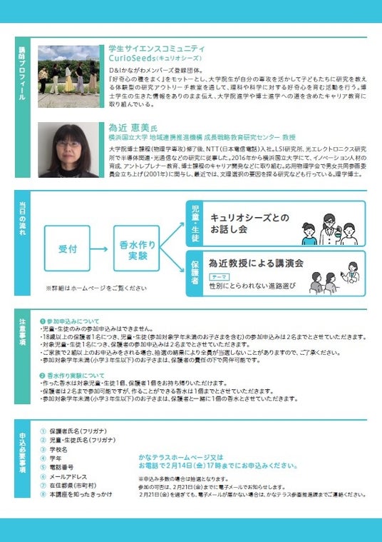 【2月14日17時まで参加者募集中!】「保護者と一緒に!子どもミライ教室~香水作り実験&大学教授・大学院生とお話し会~」