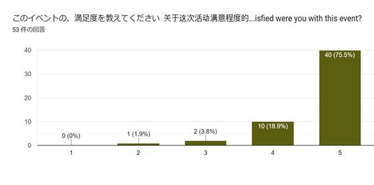 イベント参加者は57名で、出身国は12ヶ国となりました。自由な雰囲気のパーティーだったため、前回よりも英語・中国語・日本語という言語の壁なく、参加者がより自由に交流していました。イベント後アンケートでも、イベントの満足度を評価していただく項目においては5点満点中5点を選んだ方が75%以上となりました。