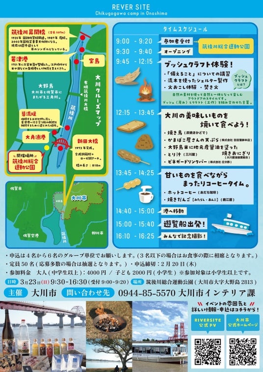 ブッシュクラフト体験や大川のグルメを味わうバーベキューのほか、遊覧船で筑後川クルーズなど筑後川や大川市のことについて遊びながら、楽しみながら学んでいただける内容となっております。ご家族やご友人、職場の仲間など、皆様のお申し込みをお待ちしております。