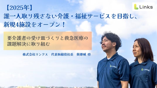 今年は「団塊の世代」が全員75歳以上になり、高齢化がさらに進むことから「2025年問題」とも呼ばれ、介護が必要なときにサービスを受けられない「介護難民」の増加が課題となっています。株式会社リンクスでは、誰一人取り残さない介護・福祉サービスを目指すべく、高齢者や医療的ケアの必要な方の受け皿を増やし、社会課題を打破すべく今後も邁進してまいります。