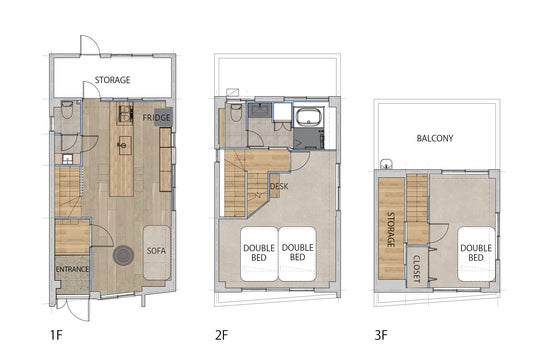 客室:3階建て、2LDK(83平方メートル )、ダブルベッド3台