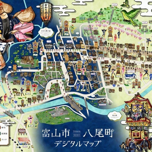 富山県富山市公式デジタルマップは、Strolyと富山県富山市が制作したイラストデジタルマップで、富山駅中心市街など市中心部の「まちなかエリア」と港町「岩瀬エリア」、今回拡充した八尾町のデジタルマップとなっています。約200[1] 店の飲食情報を地図上にまとめ、地図上や一覧から店を選ぶと、外観や料理の写真、紹介文、営業時間などの情報が見られます。また、現在地や店までの道順も調べることができます。
