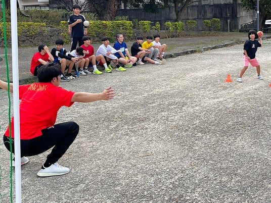 <ハンドボール体験では、琉球コラソンの選手がキーパー役に!>
