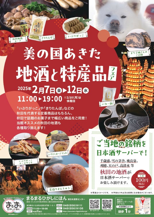 東日本の「ヒト・モノ・情報」が大宮に集合!大宮駅東口から徒歩1分のところにある、交流・発信・活性化を促す地方創生の場「まるまるひがしにほん(東日本連携センター)」で、「美の国あきた地酒と特産品フェア」を開催します!2月7日(金)~12日(水)の5日間限定イベントです。「いぶりがっこ」や「きりたんぽ」などの秋田を代表する定番商品はもちろん、秋田で話題のお菓子まで幅広い商品をご用意します。また、秋田の地酒も各種取り揃え、日本酒サーバーで1杯100円からお楽しみいただけます!この機会にぜひご来館ください!