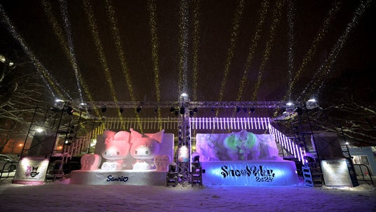 展示期間中の夜間は、『雪ミク』が北海道を応援するフェスティバル「SNOW MIKU 2025」のテーマソングにあわせたスペシャルライトアップを定期的に実施いたします。さらに、今回は隣接する雪像「マイメロディ50周年&クロミ20周年」(著作:株式会社サンリオ)とのコラボレーションも実施。初音ミクがカバーした楽曲『KAWAII FESTIVAL』(*a)に合わせたライトアップも行います。