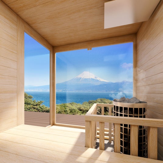 静岡の美しいロケーションに溶け込むようにデザインされた、富士青藍専用の特別な屋外サウナ。前面はすべてガラス仕様となっており、開放感あふれる空間で四季折々の自然を眺めながら贅沢なサウナ体験をお楽しみいただけます。