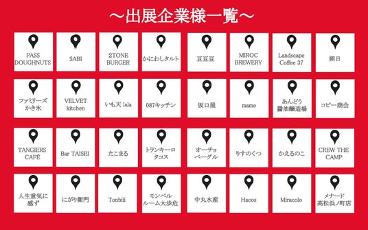 『SABI』、『朔日』、『りすのくつ』、『かにわしタルト店』、『Landscape Coffee 37』、『パス ドーナツ』など、香川・四国を代表する人気店が30店舗出店!