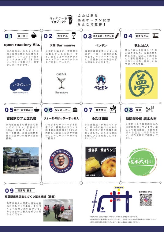 双葉駅周辺の避難指示解除直後の令和4年9月より、地域プレイヤーの発掘・連携や町の賑わい創出を目的とし、UR都市機構・コトラボ合同会社・ふたばプロジェクトの3者で定期的に実施している取組み。既存ストック(空き地や空き施設)を活用したワークショップから始まり、4歩目からは気軽に飲食・交流できる場として「ふたば飲み」を開催し、これらを通して、飲食店がまだまだ少ない双葉町で経済活動を始めるきっかけ作りを行っています。