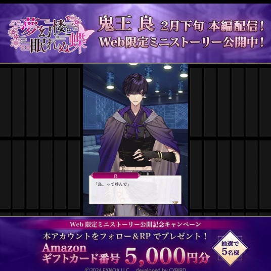 DMM GAMESを運営する合同会社EXNOA(本社:東京都港区、CEO:村中 悠介、URL:https://games.dmm.com/)は、オトナの女性向け恋愛ゲーム「夢幻楼と眠れぬ蝶」にて、鬼王良(CV:井伊筋肉)のweb限定ミニストーリーを公式サイトにて公開いたしました。また 公開を記念したXキャンペーンの開催もお知らせいたします。