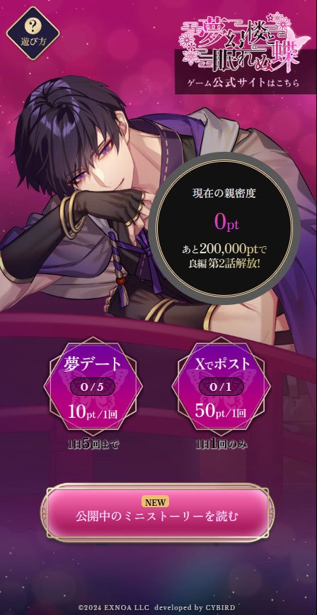 「夢幻楼と眠れぬ蝶」公式サイトにて、良のWeb限定ミニストーリーを公開いたしました。ストーリーはユーザー全体の「親密度」に応じて解放され、「親密度」はWebでの夢デートやxへのポストなどの行動で上げることができます。